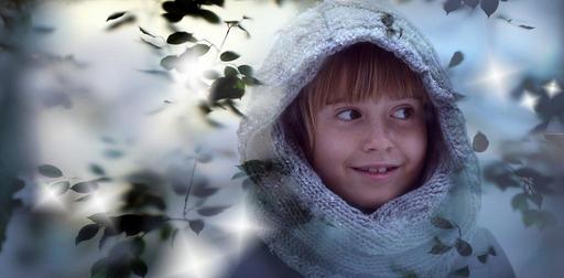 Keywords: happy child human girl forest fog dwarf smile luck cold winter
