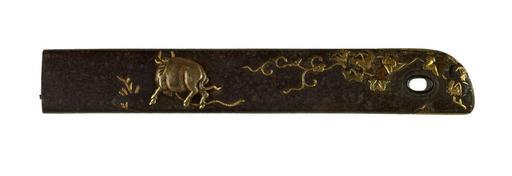 | Keywords: Haratsune - Kozuka with Ox and Ivy - Walters 51648.jpg At the right of the kozuka is an ox facing away from the viewer It is at a small stream and has a led rope attached On the right is ivy On the back bundles of rice straw are shown near a stream century 19 iron gold cm 10 1 accession number 51 648 30624 Henry Walters Baltimore date and mode of acquisition unknown Walters Art Museum Henry Walters Acquired by Henry Walters Seal unread; Signature ôjû Harutsune; Translation By special request Harutsune place of origin Japan Walters Art Museum license Kozuka in the Walters Art Museum Media contributed by the Walters Art Museum needs category review Haratsune |