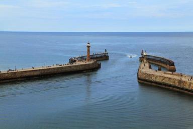 Keywords: blue boat calm dock entrance harbor harbour horizon lighthouse marine ocean pier port sea seascape sky water whitby