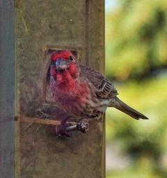 Keywords: animal bird outdoor Watchful purple finch at feeder Watchful purple finch at feeder