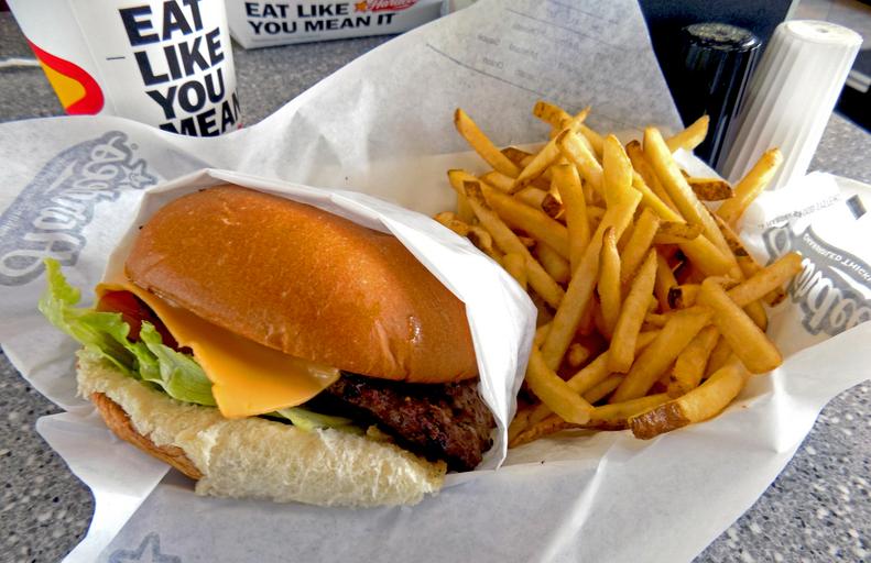 MAKE A MEME View Large Image Burgers in Real Life: The Hardee's All-Natural Cheese Burger. Charbroil flavor, raw red onion, and sweet bun are key tastes. Fries are really good. It would be at Carl's Jr. on the West Coast. Burgers in Real Life: The Hardee's All-Natural ...