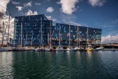 Keywords: harpa iceland icelandic static atlantic ocean travel calm new waterfront urban landmark architectural night summer dusk twilight building northern modern yachts mirror summer sun opera famous reflection architecture