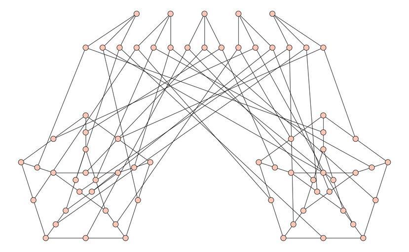 Keywords: Harries graph petersen drawing.jpg en Drawing of the Harries Graph This drawing emphasizes the 4 differents orbits in the graph's automorphism group This graph is actually built from two disjoint copies of the Petersen graph 1st orbit whose edges are then subdivided and the vertices subdividing the edges are the second orbit and paired together by a third class of 15 vertices these being joined by 5 others own Nathann cohen 2012-05-15 Released into the public domain by the author en wikipedia Nathann cohen Harries graph |