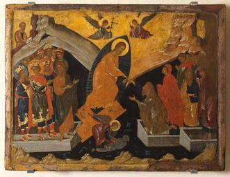 | Keywords: Harrowing of hell (Constantinople, 14th c.).jpg Η Εις Άδου Κάθοδος τέλη 14ου αιώνα 47 2x62εκ άγνωστος ζωγράφος α ό την Κωνσταντινού ολη Η εικόνα αρουσιάζει την Ανάσταση του Χριστού η ο οία στη βυζαντινή τέχνη α οδίδεται με την Κάθοδο του Χριστού στον Άδη σύμφωνα και με το α όκρυφο ευαγγέλιο του ικοδήμου Ο Χριστός στο κέντρο μέσα σε δόξα και μ ροστά α ό μεγάλη σ ηλιά ατάει στις ύλες του Άδη και ανασηκώνει α ό την ανοιχτή σαρκοφάγο τον Αδάμ Πίσω α ό τον Αδάμ στέκονται η Εύα ροφήτες και δίκαιοι και α ό την άλλη λευρά ο Πρόδρομος ο Σολομών ο Δαβίδ και άλλοι ροφήτες βασιλείς α ό την Παλαιά Διαθήκη Χαμηλά στο κέντρο ένας άγγελος αλυσσοδένει τον Άδη Ε άνω στο χρυσό βάθος δύο άγγελοι ετούν κρατώντας τα σύμβολα του Πάθους και αριστερά ίσω α ό τον βράχο ροβάλλει ο ροφήτης Ιωνάς http //eib xanthi ilsp gr/gr/icons asp late 14th century Constantinople school PD-old Files uploaded by Shakko from various sources Icons of the harrowing of hell 14th-century icons of Byzantine Empire |