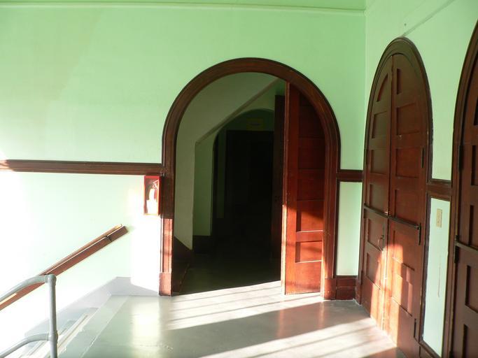 Keywords: Hartington auditorium upper lobby face N.JPG Hartington Nebraska upper entrance lobby facing north The building's west front entrance is out of the frame down the half-flight of stairs at left The closed doors at right lead to the basketball court but are blocked from that side The arch in the center leads to a hallway Turning left west immediately upon passing through the arch leads to a stairway which runs upward first west and then east before ending at a locked door leading southward into a room apparently with exterior windows Turning right east immediately upon passing through the arch leads through a second arched doorway to the basketball court Going straight ahead upon passing through the arch leads down a hallway that ends at a small restroom with a single toilet in which there is an east-facing exterior window looking down the north wall of the building own Ammodramus 2010-11-01 Pictures by Ammodramus Taken with Panasonic Lumix DMC-FZ20 Hartington Nebraska city auditorium |