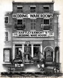 | Keywords: library company of philadelphia librarycompanyofphiladelphia lithography (philadelphia, pa.) lithographyphiladelphiapa philadelphia on stone philadelphiaonstone advertisements (philadelphia, pa.) advertisementsphiladelphiapa upholstery trade (philadelphia, pa.) upholsterytradephiladelphiapa bedding industry (philadelphia, pa.) beddingindustryphiladelphiapa merchandise displays (philadelphia, pa.) merchandisedisplaysphiladelphiapa outdoor Advertisement showing the cluttered-looking three-story storefront of the bedding warehouse on the 200 block of South Second Street. A clerk, possibly one of the proprietors, stands at the main entrance to his store and points to a disheveled display of mattresses, one of many. Behind him, a couple enters the wareroom in which two women work in a backroom. The couple walks under a framed figure of a goose hanging above the doorway. Partners Joseph Hartley and Reeve L. Knight relocated to this address circa 1842 and remained in a partnership until 1854. Advertisement showing the cluttered-looking three-story storefront of the bedding warehouse on the 200 block of South Second Street. A clerk, possibly one of the proprietors, stands at the main entrance to his store and points to a disheveled display of mattresses, one of many. Behind him, a couple enters the wareroom in which two women work in a backroom. The couple walks under a framed figure of a goose hanging above the doorway. Partners Joseph Hartley and Reeve L. Knight relocated to this address circa 1842 and remained in a partnership until 1854. |
