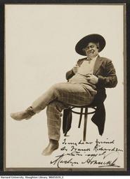 | Keywords: Harvard Theatre Collection - Macklyn Arbuckle TCS 1.578.jpg en Cabinet card image of American stage and screen actor Macklyn Arbuckle 1866-1931 in character for County Chairman staged in 1903 filmed in 1914 sitting in a chair Original is signed by the actor http //via lib harvard edu 80/via/deliver/deepLinkItem recordId olvwork605020 componentId FHCL Hough 5023375 TCS 1 578 Harvard Theatre Collection Harvard University This is a media file that Houghton Library believes to be in the public domain of the United States This applies to a work published before January 1 1923 or the unpublished work of an author who died more than 70 years ago Houghton Library and Harvard University claim no rights in this photographic reproduction of the work and the image is free to download and reproduce for any use commercial or non-commercial without any further permission required We request that where these media files are used the Houghton Library is credited as the source of the materials Please include this citation TCS 1 578 Harvard Theatre Collection Harvard University as its source In the event that any of the media files infringes your rights or the rights of any third parties or file is not properly identified or acknowledged we would like to hear from you so we may make any necessary alterations In this event please contact Houghton_Library harvard edu Institution Houghton Library circa 1903 1914 http //via lib harvard edu 80/via/deliver/deepLinkItem recordId olvwork605020 componentId FHCL Hough 5023375 TCS 1 578 Harvard Theatre Collection Harvard University Photographer unidentified PD-old Macklyn Arbuckle Harvard Theatre Collection The County Chairman |