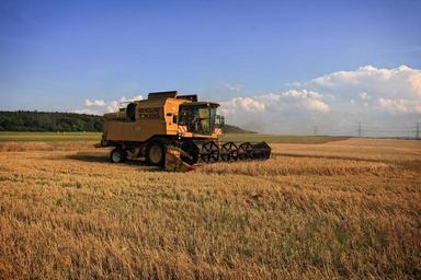 Keywords: harvest harvester blue sky agriculture farming harvesting wheat field grain summer countryside combine agricultural landscape industry machine yellow