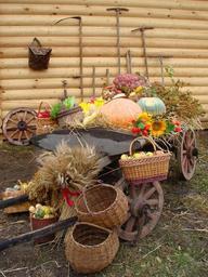 Keywords: harvest produce cart wagon pumpkins apples vegetables basket close-up autumn fall log cabin