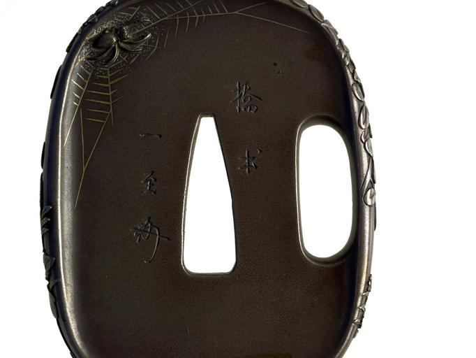 | Keywords: Hashimoto Isshi I - Tsuba with Autumn Grasses with Spider and Butterflies - Walters 51401 - Mark A.jpg On the front of this tsuba are various autumn flowers including chrysanthemums maiden flower arrowroot and pampas grass On the reverse is a spider in a web in the upper left Butterflies are on the edge at the right and top between 1850 1871 late Edo-Meiji shibuichi gilt cm 5 accession number 51 401 29273 Henry Walters Baltimore date and mode of acquisiton unknown Walters Art Museum Henry Walters Acquired by Henry Walters Signature Hashimoto/Isshi kao place of origin Edo present-day Tokyo Japan Walters Art Museum license Tsuba in the Walters Art Museum Hashimoto Isshi I Media contributed by the Walters Art Museum needs category review |