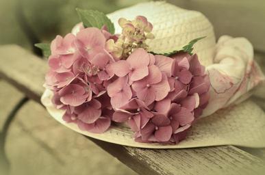 Keywords: hat sun hat hydrangea pale reduced color depth romance romantic garden bench greetings flowers summer brim straw hat