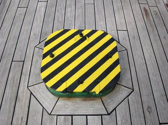 Keywords: hatch deck ship vessel danger wood decking yellow black warning wooden planks maritime shipping industrial transportation
