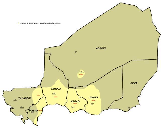 | Keywords: Hausa language niger.png en Areas in Niger where Hausa language is spoken Note Speakers of Hausa are mixed with speakers of other languages and thus this map does not necessarily represent areas with Hausa speaking majority own PANONIAN 2011 Cc-zero References Linguistic map of Niger from www ethnologue com http //www ethnologue com/maps/ner_eth jpg Borders of provinces of Niger and locations of provincial capitals are drawn according to the UN map of Niger http //commons wikimedia org/wiki/File Un-niger png Sizable cities in Niger are selected in accordance with the info from World Gazetteer page for Niger http //world-gazetteer com/wg php x men gcis lng en des wg srt npan col abcdefghinoq msz 1500 geo -156 Aditional source about presence of Hausa speakers in Agadez http //www saudiaramcoworld com/issue/200301/agadez-sultanate of the sahara htm Linguistic maps of Niger Linguistic maps of Afro-Asiatic languages Hausa language |