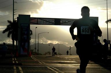 Keywords: hawaii pearl harbor sunrise light running man competition race sky clouds exercise morning street silhouette silhouettes mountains palms palm-trees nature outside