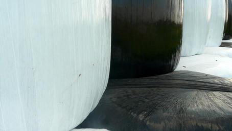 Keywords: hay hay bales packed plastic winter feed agriculture slide single hull black and white
