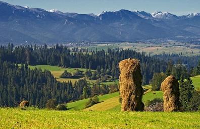 Keywords: haymaking harvest kopki hay stacks of hay view landscape nature autumn meadows forest the prospect of sunny day peace of mind the silence standard of service grass drying last swath polish tatras podhale after work