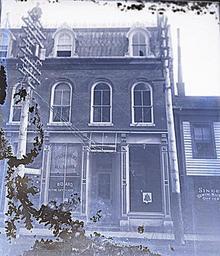 | Keywords: hotels businesses 1890s restaurants outdoor Exterior view of a hotel/restaurant offering "Meals & Lunches at All Hours". The building to the right housed a Singer sewing machine office. One of a set of glass negatives associated with Herbert 'Burt' Rathbun (1861-1897). The negative is slightly damaged. Exterior view of a hotel/restaurant offering "Meals & Lunches at All Hours". The building to the right housed a Singer sewing machine office. One of a set of glass negatives associated with Herbert 'Burt' Rathbun (1861-1897). The negative is slightly damaged. |