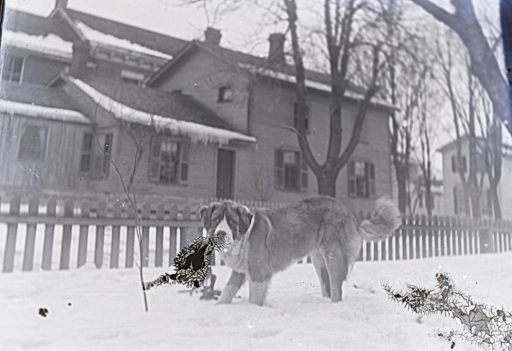 | Keywords: dogs 1890s winter houses outdoor St. Bernard dog in the snow in front of a house with a picket fence. Possibly taken in Belleville, Ontario. One of a set of glass negatives associated with Herbert 'Burt' Rathbun (1861-1897). The negative is slightly damaged. St. Bernard dog in the snow in front of a house with a picket fence. Possibly taken in Belleville, Ontario. One of a set of glass negatives associated with Herbert 'Burt' Rathbun (1861-1897). The negative is slightly damaged. | ||||