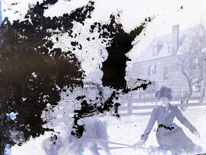 | Keywords: 1890s women dogs sleds winter houses snow outdoor Woman [perhaps Agnes Rathbun, née Bell] on a sled being pulled by a St. Bernard dog. There is a three-story building in the background. One of a set of glass negatives associated with Herbert 'Burt' Rathbun (1861-1897). The negative is badly damaged on the left side. Woman [perhaps Agnes Rathbun, née Bell] on a sled being pulled by a St. Bernard dog. There is a three-story building in the background. One of a set of glass negatives associated with Herbert 'Burt' Rathbun (1861-1897). The negative is badly damaged on the left side. |