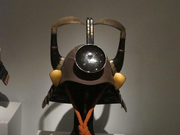 Keywords: Head-shaped helmet with a sake cup, a pair of chopsticks, and pair of sickles, 17th century.JPG en Head-shaped helmet with a sake cup a pair of chopsticks and a pair of sickles Edo period 17th century iron wood lacquer silk and gold own Haa900 photo 2013 Zunari kabuto Wakidate Cc-zero |