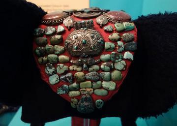 | Keywords: Headdress, Ladakh, India, 20th century, wool, cotton, turquoise, silver, carnelian - Fernbank Museum of Natural History - DSC09983.JPG en Exhibit in the Fernbank Museum of Natural History Atlanta Georgia USA Photography was permitted in the museum without restriction 2012-03-17 00 40 20 own Daderot cc-zero Ethnographic items in the Fernbank Museum of Natural History Uploaded with UploadWizard Jewellery of Ladakh | ||||