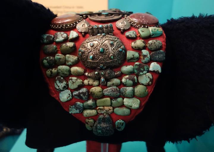 Keywords: Headdress, Ladakh, India, 20th century, wool, cotton, turquoise, silver, carnelian - Fernbank Museum of Natural History - DSC09983.JPG en Exhibit in the Fernbank Museum of Natural History Atlanta Georgia USA Photography was permitted in the museum without restriction 2012-03-17 00 40 20 own Daderot cc-zero Ethnographic items in the Fernbank Museum of Natural History Uploaded with UploadWizard Jewellery of Ladakh |