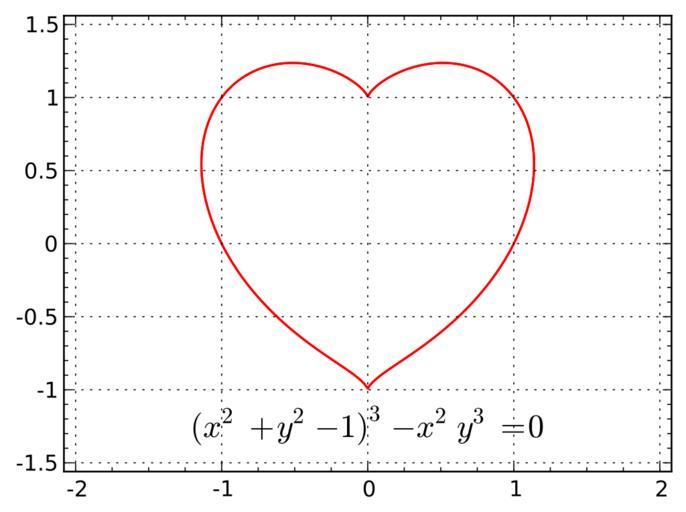 Keywords: Heart plot.svg Created with Sage Sage code <source lang python> implicit_plot x 2 + y 2 - 1 3 - x 2 y 3 -2 2 -1 5 1 5 aspect_ratio 1 color 'red' plot_points 1000 \ gridlines True figsize 5 5 + text ' x 2 + y 2 - 1 3 - x 2y 3 0 ' 0 -1 25 color 'black' fontsize 15 </source> own Eviatar Bach 2011-09-26 Cc-zero Heart shapes in mathematics Images with Sage source code Algebraic functions Files by User InverseHypercube |