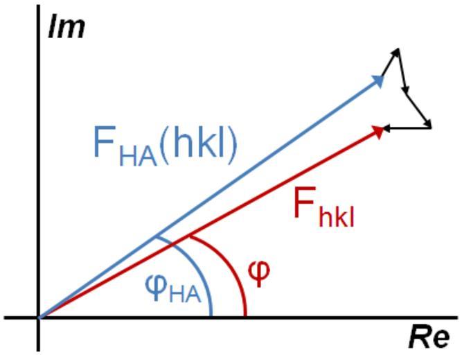 | Keywords: Heavy atom.png  en Principle of the heavy atom method in crystal structure solution the contribution from the partial structure factor of the heavy atom F<sub>HA</sub> hkl dominates the total structure factor F hkl for a reflection hkl Both structure factors are represented in the plane of complex numbers The red vector is the total structure factor of the reflection hkl the blue vector is the partial structure factor from the heavy atoms The contributions from other lighter atoms are shown in black own Perditax 2011-10-07 Cc-zero X-ray diffraction |