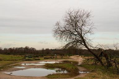 Keywords: heide tree puddle nature reserve hiking landscape storm damage water away trail sky promenade rest walk hike go for a walk nature rain puddle