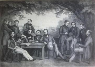 | Keywords: HeidelbergerClub1847.jpg Mitglieder des Heidelberger Clubs auf der Elbterrasse des Jacob in Nienstedten Lithographie von Otto Speckter 1847 Abgebildet von links nach rechts Alfred Schädtler Journalist Corps Hanseatia Göttingen und Corps Hanseatia Heidelberg Joachim Hübener Arzt Corps Hanseatia Heidelberg Ernst Goßler Präses des Niedergerichts Gustav Niebuhr Arzt Corps Hanseatia Heidelberg Robert Herzfeld Arzt Corps Hanseatia Heidelberg; Stifter des Clubs Julius Dalmer Kaffeemakler Corps Hanseatia Heidelberg und Corps Vandalia Rostock de Gerhard von Hoßtrup Herausgeber der Börsenhalle Corps Hanseatia Heidelberg Diedrich Eckmeyer Prokurator Corps Hanseatia Heidelberg; Stifter des Clubs Hermann Gernet Physikus Corps Hanseatia Heidelberg; Stifter des Clubs Senatssyndikus de Carl Hermann Merck BM Carl Petersen Corps Hansea Göttingen Corps Saxo-Borussia Heidelberg und Stifter des Corps Hanseatia Heidelberg Julius des Arts Advokat Corps Borussia Göttingen BM Gustav H Kirchenpauer Scanned by uploader; Wiedergabe aus Rittmeyer Der AC zu Hamburg 1859-1964 Seite 1 Hamburg 1964 1847 Creator Otto Speckter PD-old-100 Otto Speckter Heidelberger Club 1847 works in Germany Speckter Heidelberger Club People of Hamburg Heidelberger Club Kösener Corpsstudent Hotelrestaurant Louis C Jacob Speckter Heidelberger Club Carl Friedrich Petersen Speckter Heidelberger Club Gustav Heinrich Kirchenpauer Speckter Heidelberger Club Hamburg in the 1840s Speckter Heidelberger Club Clubs and societies in Germany Heidelberger Club Corps Hanseatia Heidelberg Speckter Der Altherren Convent zu Hamburg Gerhard von Hoßtrup Carl Hermann Merck Ernst Gossler People of Germany in 1847 |