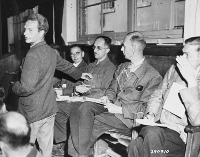 | Keywords: Heinrich Schmidt.jpeg en Vans Maienschein a prosecution witness points out former camp doctor Heinrich Schmidt as the man who let patients die because of lack of medical care at the trial of former camp personnel and prisoners from Dora-Mittelbau Locale Dachau Bavaria Germany USHMM courtesy of National Archives and Records Administration College Park Photograph 43064 Author 1947-09-19 Copyright Public Domain On August 7 1947 an American Military Tribunal in Dachau Germany brought to trial nineteen former camp personnel and prisoners from the Dora-Mittelbau concentration camp system including a number of its sub-camps All of the defendants were charged with beating and killing inmates as well as with indulging in acts of personal sadism against them Some specific charges were also raised against individual defendants Shortly after the defense opened its case on October 25 the four kapos among the accused testified against their fellow defendants providing additionally incriminating evidence The tribunal's findings were announced on December 24 and all but four of the defendants were found guilty Following Christmas sentences were announced on 30 December with former SS-Obersturmfuehrer Hans Karl Moeser being the only man sentenced to death Seven others were sentenced to life in prison while the rest received various jail terms Every one of the defendants with the exception of one person was released after serving only from seven to ten years Moeser was executed in June 1948 PD-USGov Andrae Trial |