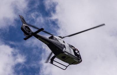 Keywords: helicopter aircraft flying survey man camera sky blue clouds flight aviation