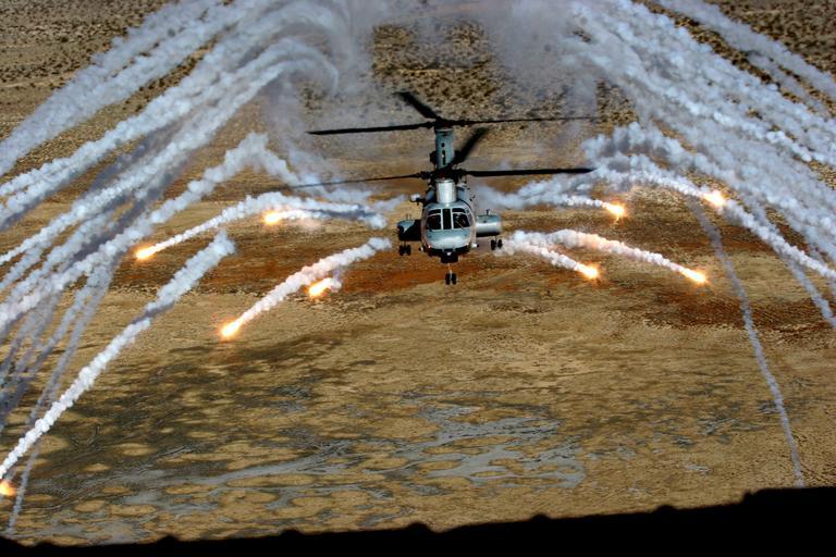 Keywords: Helicopter and flares.jpg 070313-M-3968C-012 RIDGECREST California March 13 2007 - A CH-46 Sea Knight assigned to Marine Helicopter Squadron One Presidential Helicopter Squadron deploys its MJU-32/B round flares over Naval Air Weapons Station China Lake The squadron was participating in a testing event for a new deployment tactic for the 36mm MJU-32/B round flare U S Marine Corps photo by Lance Corporal Kelly R Chase RELEASED Hubschrauber wirft Flare ab http //www navy mil/view_image asp id 44250 2007-03-17 Kelly R Chase PD-USGov-Military-Navy CH-46 Sea Knight Decoy flares Naval Air Weapons Station China Lake |