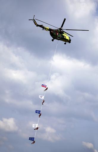 Keywords: helicopter rope flags skydivers the sky airshow sliač slovakia