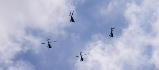Keywords: helicopters aircraft four 4 flying sky blue clouds flight aviation