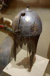 | Keywords: Helmet with chain mail skirt and nose guard, Iran, Qajar dynasty, 2nd half of 19th century, steel damascened with gold and silver - Huntington Museum of Art - DSC04938.JPG en Exhibit in the Huntington Museum of Art Huntington West Virginia USA Photography was permitted in the museum without restriction This artwork is in the public domain because the artist died more than 70 years ago 2013-05-16 13 50 32 own Daderot cc-zero Weapons in the Huntington Museum of Art Uploaded with UploadWizard Military of the Qajar dynasty Kulah khud |