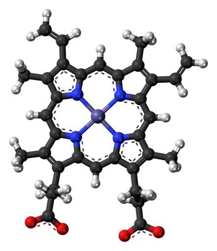 Keywords: Heme B anion 3D ball.png Ball-and-stick model of the Heme B complex also known as haem B the core of hemoglobin that carries oxygen in blood This image shows the anionic form with a negative charge of 2 Colour code 505050 Carbon C black<br> F0F0F0 Hydrogen H white<br> F51E1E Oxygen O red<br> 3C50FA Nitrogen N blue<br> 8078C0 Iron Fe grey-purple<br> 2011-06-27 own DS Visualizer Jynto talk Neutral form ball-and-stick version Neutral form space-filling version Anionic form space-filling version cc-zero Images by Jynto Ball-and-stick models Haem b |