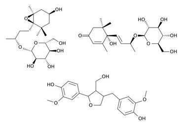 Keywords: Hemerocallis antioxidants.svg Antioxidants in Hemerocallis fulva Left Phlomurosid Right Roseosid Bottom Lariciresinol single files also on WikiCommons created with bkchem+inkscape 2006-04-16 own assumed Ayacop Glycosides