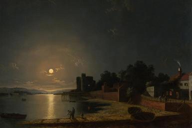 Keywords: henry pether painting oil on canvas artistic nature outside sky clouds landscape country countryside forest trees shoreline lake river water reflections night