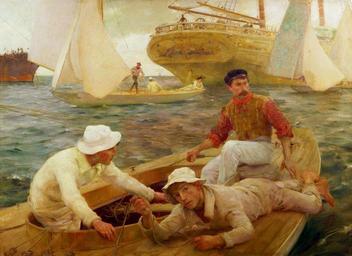 | Keywords: Henry Scott Tuke - The Run Home.jpg Artwork Creator Henry Scott Tuke 1902 Oil on canvas cm 119 162 Royal Cornwall Museum Truro Cornwall UK http //www bbc co uk/arts/yourpaintings/paintings/the-run-home-14508 BBC Your Paintings object history credit line gift 1930 accession number TRURI 1930 14 77706 PD-old-auto-1923 1923 Sailors by Henry Scott Tuke People with boats in art Oil paintings of seascapes 1902 paintings | ||||