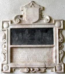 | Keywords: HenryHurdinge Died1627 MonkleighChurch Devon.PNG Poltimore and Bampfylde House in Exeter both in Devon Sheriff of Devon in 1576 By Gertrude Bampfield he had two daughters including Elizabeth Hurding d 1668 who married firstly John Coffin d 1622 of Portledge lord of the manors of Alwington and Monkleigh and secondly Hugh Prust d 1666 of Annery Monkleigh Source Pedigrees of the various families in Vivian Lt Col J L Ed The Visitation of the County of Devon Comprising the Heralds' Visitations of 1531 1564 1620 Exeter 1895 Inscription Henry Hurdinge of Longe Breedy in Cou<sup>y </sup> Dorset Esq<sup>r</sup> was buried here the 28 day of Febr 1627 who had by Gartrude Bampfyld his first wife 2 daughters By Eliza Snowe his 2 wife 2 sonns 2 daughters </br> Hee that from home for love was hither brought </br> Hence is brought home to bliss that God hath wrou ght </br> own photo Lobsterthermidor <span class signature-talk ></span> 16 26 20 August 2015 UTC 2013 Monkleigh church Wall mounted church monuments in Devon |