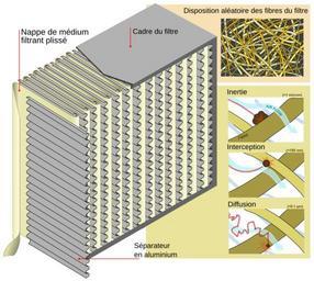 | Keywords: HEPA Filter diagram fr.svg diagram showing the main parts of a HEPA filter on the large diagram; its operation is shown on the 3 smaller diagrams the thick brown/tan lines represent fibers in the filter medium the blue lines represent air flow The dark circle represents a particle dust bacteria spore etc the dotted red line represents the trajectory of the particle; consider that as soon as a particle comes within one radius of a fibre it adheres to it in the case of diffusion the particle usually 0 1 µm or smaller has such a trajectory because of the collision with gas molecules On the 100 nm to 1 micron scales that are the most challenging for filters it is helpful to think of air as a viscous fluid like molasses As the fluid flows through the filters particles are carried around the fibers of the filter medium for the most part Inertial impaction Larger particles >1 micron may be massive enough to continue to move in nearly a straight line Newton's Law as the flow is diverted around a fiber Interception Smaller particles are not much affected by inertia but if they are carried within one particle radius of the fiber they will be intercepted by it Diffusion Still smaller particles <100 nm move randomly among streamlines as they are buffeted by collisions with molecules A particle along a streamline that approaches a fiber very closely may be knocked against the fiber by such a collision PGIP HEPA_Filter_diagram_en svg through HEPA_Filter_diagram_de svg 2010-09-10 18 24 UTC HEPA_Filter_diagram_en svg LadyofHats HEPA_Filter_diagram_de svg Rotkäppchen derivative work The RedBurn <span class signature-talk >talk</span> The RedBurn Translation to French The RedBurn HEPA_Filter_diagram_en svg Original upload log This image is a derivative work of the following images File HEPA_Filter_diagram_en svg licensed with PD-user 2008-09-01T08 06 29Z LadyofHats 607x544 404084 Bytes <nowiki>corrected particle size aded average size of particles and trajectory on difuccion</nowiki> 2008-08-15T21 55 12Z LadyofHats 607x544 393067 Bytes <nowiki>darker text</nowiki> 2008-08-14T21 17 27Z LadyofHats 607x544 393021 Bytes <nowiki>this is a corrected version of the original</nowiki> 2008-08-14T21 16 33Z LadyofHats 607x544 327559 Bytes <nowiki>THID VERSION CONTAINS LABELS AS TEXT </nowiki> 2008-08-13T16 01 32Z LadyofHats 607x544 391421 Bytes <nowiki> diagram showing the main parts of a HEPA filter and the way it works Did myself using this sources http //people seas harvard edu/~jones/lab_arch/nano_facilities/hepa gif http //www sa</nowiki> Uploaded with derivativeFX High-Efficiency Particulate Arresting Philip Greenspun illustration project SVG diagrams in French |