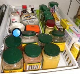 Keywords: Herbs&Spices.JPG en Tray of herbs and spices found in a pantry own Vicki Nunn Spice jars Dried herbs