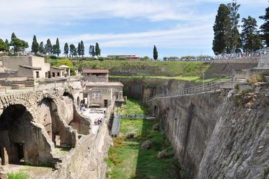 | Keywords: architecture outdoor ruins rampart stonework arch "Located in the shadow of Mount Vesuvius, Herculaneum (Italian: Ercolano) was an ancient Roman town destroyed by volcanic pyroclastic flows in 79 AD. Its ruins are located in the commune of Ercolano, Campania, Italy. It is most famous for having been lost, along with Pompeii, Stabiae, Oplontis and the neighborhood of Monte Bursaccio in Boscoreale, in the eruption of Mount Vesuvius in AD 79 that buried it in superheated pyroclastic material. It is also famous as one of the few ancient cities that can now be seen in almost its original splendor; unlike Pompeii, it was mainly affected by pyroclastic flows, thus preserving the wooden objects such as roof tops, building beams, beds, doors, and even food. Moreover, Herculaneum was a wealthier town than Pompeii, possessing an extraordinary density of fine houses, and far more lavish use of colored marble cladding. The discovery in recent years of some 300 skeletons along the sea shore came as a surprise, as it had been assumed that the town had been evacuated." ~Wikipedia "Located in the shadow of Mount Vesuvius, Herculaneum (Italian: Ercolano) was an ancient Roman town destroyed by volcanic pyroclastic flows in 79 AD. Its ruins are located in the commune of Ercolano, Campania, Italy. It is most famous for having been lost, along with Pompeii, Stabiae, Oplontis and the neighborhood of Monte Bursaccio in Boscoreale, in the eruption of Mount Vesuvius in AD 79 that buried it in superheated pyroclastic material. It is also famous as one of the few ancient cities that can now be seen in almost its original splendor; unlike Pompeii, it was mainly affected by pyroclastic flows, thus preserving the wooden objects such as roof tops, building beams, beds, doors, and even food. Moreover, Herculaneum was a wealthier town than Pompeii, possessing an extraordinary density of fine houses, and far more lavish use of colored marble cladding. The discovery in recent years of some 300 skeletons along the sea shore came as a surprise, as it had been assumed that the town had been evacuated." ~Wikipedia |