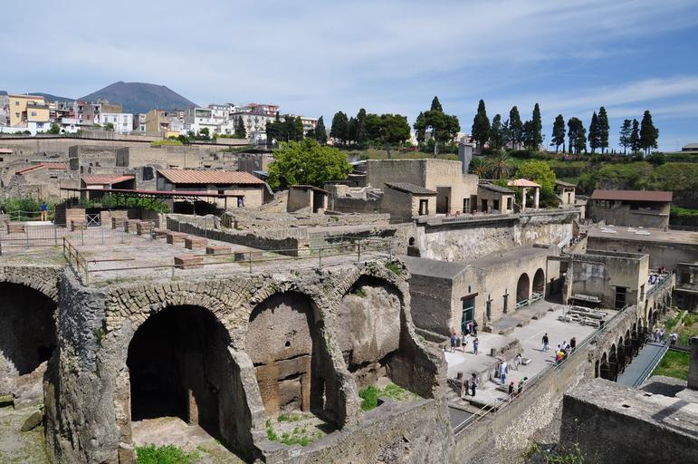 Keywords: architecture ruins outdoor arch rampart "Located in the shadow of Mount Vesuvius, Herculaneum (Italian: Ercolano) was an ancient Roman town destroyed by volcanic pyroclastic flows in 79 AD. Its ruins are located in the commune of Ercolano, Campania, Italy. It is most famous for having been lost, along with Pompeii, Stabiae, Oplontis and the neighborhood of Monte Bursaccio in Boscoreale, in the eruption of Mount Vesuvius in AD 79 that buried it in superheated pyroclastic material. It is also famous as one of the few ancient cities that can now be seen in almost its original splendor; unlike Pompeii, it was mainly affected by pyroclastic flows, thus preserving the wooden objects such as roof tops, building beams, beds, doors, and even food. Moreover, Herculaneum was a wealthier town than Pompeii, possessing an extraordinary density of fine houses, and far more lavish use of colored marble cladding. The discovery in recent years of some 300 skeletons along the sea shore came as a surprise, as it had been assumed that the town had been evacuated." ~Wikipedia "Located in the shadow of Mount Vesuvius, Herculaneum (Italian: Ercolano) was an ancient Roman town destroyed by volcanic pyroclastic flows in 79 AD. Its ruins are located in the commune of Ercolano, Campania, Italy. It is most famous for having been lost, along with Pompeii, Stabiae, Oplontis and the neighborhood of Monte Bursaccio in Boscoreale, in the eruption of Mount Vesuvius in AD 79 that buried it in superheated pyroclastic material. It is also famous as one of the few ancient cities that can now be seen in almost its original splendor; unlike Pompeii, it was mainly affected by pyroclastic flows, thus preserving the wooden objects such as roof tops, building beams, beds, doors, and even food. Moreover, Herculaneum was a wealthier town than Pompeii, possessing an extraordinary density of fine houses, and far more lavish use of colored marble cladding. The discovery in recent years of some 300 skeletons along the sea shore came as a surprise, as it had been assumed that the town had been evacuated." ~Wikipedia |