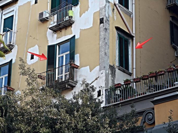 Keywords: giacomo leopardi giacomoleopardi literature poet naples italy architecture outdoor building L’ULTIMA DIMORA DI GIACOMO LEOPARDI Nella foto le frecce indicano la stanza nella quale il 14 giugno 1837 è morto Giacomo Leopardi. Fa parte dell’abitazione in Vico Pero n° 2 a Napoli, secondo piano, che vista dall’antica via per Capodimonte (oggi Via Santa Teresa degli Scalzi) appare al terzo piano, a causa del dislivello tra le due strade. Antonio Ranieri, riferendo gli ultimi istanti dell’amico, scrive: “…quando io sopraggiunsi col Mannella, lo trovammo né anche a giacere, ma solamente sulla sponda [del letto], con alcuni guanciali di traverso che lo sostenevano […] il Mannella, tiratomi destramente da parte, mi ammonì di mandare incontinente per un prete; che di altro non v’era tempo […] la Paolina gli sosteneva il capo e gli asciugava il sudore che veniva giù a goccioli da quell’ampissima fronte […] aperti più dell’usato gli occhi, mi guardò più fiso che mai. Poscia: Io non ti veggo più, mi disse come sospirando. E cessò di respirare”. Propero Viani, commentando l’ultima lettera di Leopardi dell’ “Epistolario” da lui pubblicato, indirizzata al padre e datata “Napoli, 27 maggio 1837”, annota: “Morto dopo diciotto giorni, a’ 14 di giugno. Le ultime parole di lui furono queste, rivolte alla sorella di Antonio Ranieri, in casa del quale morì: ‘Ci vedo più poco… apri quella finestra… fammi veder la luce…’ ”. Tra le due dichiarazioni (Ranieri, Viani) va notato il comune riferimento al venir meno della luce e alla presenza di Paolina Ranieri. Ritengo a questo punto riportare INTEGRALMENTE la lettera del prof. Michelangelo Parlato, pubblicata sul quotidiano napoletano “Roma” del 24 marzo 1937, dal titolo “La casa di Leopardi a Santa Teresa”. È appena il caso di rilevare la scrupolosa serietà dell’indagine, fondata sui dati riportati dal contratto di fitto e dall’ispezione sui colori delle pareti delle singole stanze. Invito quindi alla massima attenzione. “Illustre Direttore, Credendo di rendermi utile nell’occasione delle celebrazioni leopardiane, invitato da funzionarii del Municipio di Napoli pel tramite dell’illustre prof. Onorato Fava, ho potuto ieri precisare il piano e le camere abitate da Giacomo Leopardi nell’ultimo periodo della sua vita. “Premetto la trascrizione dei brani relativi al contratto di locazione che fu stipulato il 5 maggio 1835 pel tramite del signor Michele Giura, procuratore del signor Prospero Iasillo, proprietario della casa sita in Vico del Pero N. 2, i cui discendenti ancora oggi posseggono. “La casa era composta: di una saletta, di un’anticameretta, di una stanza di compagnia (salotto) dipinta di giallo ‘groma’ di una stanza da letto – quella dell’infelice Poeta – attinta di color verde azzurro, di una seconda stanzetta da letto, dipinta color turchino, di uno stanzino esposto a mezzogiorno, dipinto color verde composto ed accessorii, tutti minuscoli. “La casa si affaccia anche dal Vico Pero. “In base a questi sicuri elementi rintracciati nel periodo studentesco a mezzo dell’insigne, compianto mio professore Domenico Polisieri, per la prima volta mi sono recato in compagnia del signor Ancone Giovanni venuto da parte del Comune, a Vico Pero N. 2, al secondo piano, dal lato sinistro salendo, (che corrisponde al 3. piano di Via S. Teresa) ed ho potuto constatare mercè assaggi permessi dalla gentile proprietaria, che la camera di compagnia e la camera da letto conservano sotto l’intonaco le tracce visibilissime del colore giallo cromo la prima, e del colore verde azzurro la seconda, così come risultano dal contratto stesso. “Un’altra conferma per l’identificazione della stanza del Poeta, della quale, nell’ultima lettera a suo padre in data 27 maggio 1837 dice: ‘Tornato di campagna malato ai 16 di febbraio non uscii mai di camera fino al 15 marzo’ l’ho avuta dalle ultime parole di lui rivolte alla sorella di A. Ranieri citate da Prospero Viani come chiusa all’epistolario, stampato la prima volta appena undici anni dopo la morte del Leopardi, che gli sono state dette da un amico di casa Ranieri: “…ci vedo più poco… apri quella finestra… fammi veder la luce”. “Infatti la stanza da letto identificata dal colore verde azzurro, ha un balcone ed una finestra, nomi dal Leopardi ben distinti. “Nessun dubbio per tanto rimane sulla casa di abitazione del Leopardi, resta perfettamente identificata la dimora in Napoli dove morì il più grande poeta lirico che vanta l’Italia. “Grato dell’ospitalità che vorrà, signor Direttore, concedere a questa mia, accolga grato i miei ringraziamenti ed ossequii. “Napoli 23-3-1937 XV “dev.mo “Prof. Michelangelo Parlato” L’ULTIMA DIMORA DI GIACOMO LEOPARDI Nella foto le frecce indicano la stanza nella quale il 14 giugno 1837 è morto Giacomo Leopardi. Fa parte dell’abitazione in Vico Pero n° 2 a Napoli, secondo piano, che vista dall’antica via per Capodimonte (oggi Via Santa Teresa degli Scalzi) appare al terzo piano, a causa del dislivello tra le due strade. Antonio Ranieri, riferendo gli ultimi istanti dell’amico, scrive: “…quando io sopraggiunsi col Mannella, lo trovammo né anche a giacere, ma solamente sulla sponda [del letto], con alcuni guanciali di traverso che lo sostenevano […] il Mannella, tiratomi destramente da parte, mi ammonì di mandare incontinente per un prete; che di altro non v’era tempo […] la Paolina gli sosteneva il capo e gli asciugava il sudore che veniva giù a goccioli da quell’ampissima fronte […] aperti più dell’usato gli occhi, mi guardò più fiso che mai. Poscia: Io non ti veggo più, mi disse come sospirando. E cessò di respirare”. Propero Viani, commentando l’ultima lettera di Leopardi dell’ “Epistolario” da lui pubblicato, indirizzata al padre e datata “Napoli, 27 maggio 1837”, annota: “Morto dopo diciotto g