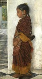 | Keywords: Hermann Linde - Girl standing in a veranda wearing a Pochampalli sari (ca.1895).jpg Artwork creator Hermann Linde ~ 1895 oil canvas cm 113 63 accession number object history credit line exhibition history H Linde ~ lower left signature possibly Hyderabad circa 3rd quarter of the 19th Century http //www sothebys com/en/auctions/ecatalogue/2007/indian-art-n08341/lot 106 html Sotheby's New York 19 Sep 2007 lot 106 Girl standing in a veranda wearing a Pochampalli sari jpg PD-old-auto-1923 1923 Hermann Linde Saris in art Portrait paintings of girls 1890s portrait paintings Women's clothing of Andhra Pradesh Paintings of women of Andhra Pradesh Verandas in art Images from Sotheby's 1890s paintings from India Children's clothing of India Andhra Pradesh in the 1890s Braids in art 1890s |