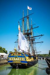 Keywords: hermione boat frigate sea stern frigate hermione la fayette france sailing vessel old rigs navigation marine sailing ship blue sky ocean