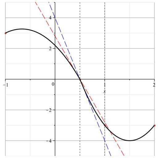 | Keywords: Hermite.svg de Tangente in x 0 5 zweier Polynominterpolationen die sich in x 0 5 treffen<br /> Erstellt in Maple mit dem Befehl <pre> with Statistics ; with plots ; Xs `< >` VectorCalculus`-` 2 VectorCalculus`-` 1 5 1 2 ; Ys `< >` VectorCalculus`-` 1 3 0 VectorCalculus`-` 3 VectorCalculus`-` 3 ; f Fit VectorCalculus`+` VectorCalculus`+` VectorCalculus` ` c x 2 VectorCalculus` ` d x e Xs1 3 Ys1 3 x ; g Fit VectorCalculus`+` VectorCalculus`+` VectorCalculus` ` c x 2 VectorCalculus` ` d x e Xs3 5 Ys3 5 x ; display plot Xs Ys style point plot VectorCalculus` ` eval diff f x x 5 VectorCalculus`+` x VectorCalculus`- ` 5 x VectorCalculus`-` 2 2 linestyle dash color red plot VectorCalculus` ` eval diff g x x 5 VectorCalculus`+` x VectorCalculus`-` 5 x VectorCalculus`-` 2 2 linestyle dash color blue plot `< >` 5 5 `< >` VectorCalculus`-` 10 10 color black linestyle dot plot `< >` 1 1 `< >` VectorCalculus`-` 10 10 color black linestyle dot gridlines view VectorCalculus`-` 1 2 VectorCalculus`-` 5 5 plot f x VectorCalculus`-` 2 5 color black numpoints 2000 plot g x 5 2 color black numpoints 2000 ; </pre> own 2011-02-21 Pberndt at http //de wikipedia org de wikipedia Datei Function tangent and vert line non continuous gif PD-release Original upload log page de wikipedia Hermite svg 2011-02-21 19 44 Pberndt 694×694× 58237 bytes <nowiki> Information Tangente in x 0 5 zweier Polynominterpolationen die sich in x 0 5 treffen Selbst erstellt ~~~ 21 02 2011 Bild-frei Andere Versionen Datei Function tangent and vert line non continuous gif </nowiki> 2011-02-21 19 41 Pberndt 744×1053× 54878 bytes <nowiki>Neue Version von Datei Function tangent and vert line non continuous gif als svg und mit Kurve im Vordergrund with Statistics ; with plots ; Xs `< >` VectorCalculus`-` 2 VectorCalculus`-` 1 5 1 2 ; Ys `< >` VectorCalculus`-` 1 </nowiki> Numerical analysis Charles Hermite |