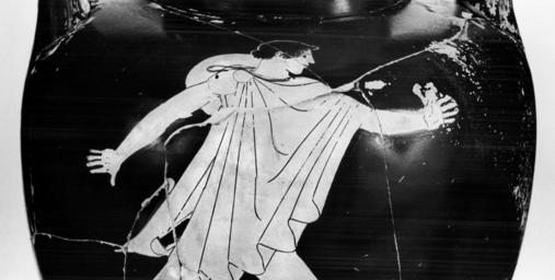 | Keywords: Hermonax - Nolan Amphora - Walters 4855 - Side B Detail.jpg The front of this amphora depicts a youth running right He wears a chlamys and fillet and has a petasos at his neck and a scabbard at his side His hands are extended to either side and his legs are spread wide indicating that he is in full stride as he pursues the woman on the back On the reverse the woman is fleeing right and is looking around She wears a chiton serpentine bracelets and a mantle which is draped over her shoulders and down her back Her torso and right leg are shown frontally her head and left leg in profile She extends her right hand back toward her pursuer while grasping the mantle at her shoulder with the left Ribbons hold her hair in place ca 470 BC Classical terracotta cm 33 2 18 3 h x max diam ; at rim cm 14 7 diam ; at foot cm 8 5 diam accession number 48 55 34196 Don Marcello Massarenti Collection Rome no 212 Henry Walters city Baltimore Walters Art Museum Henry Walters Acquired by Henry Walters possibly with the Massarenti Collection 1902 place of origin Attica Greece Walters Art Museum license Ancient Greek red-figure pottery in the Walters Art Museum Hermonax Media contributed by the Walters Art Museum needs category review Media contributed by the Walters Art Museum needs artist update |